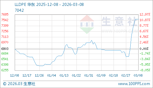 据生意社监测,LLDPE03月08日最新价格7566.66元/吨,最近5天上涨6.20%配资炒股APP,10天上涨12.54%,60天上涨15.11%。
